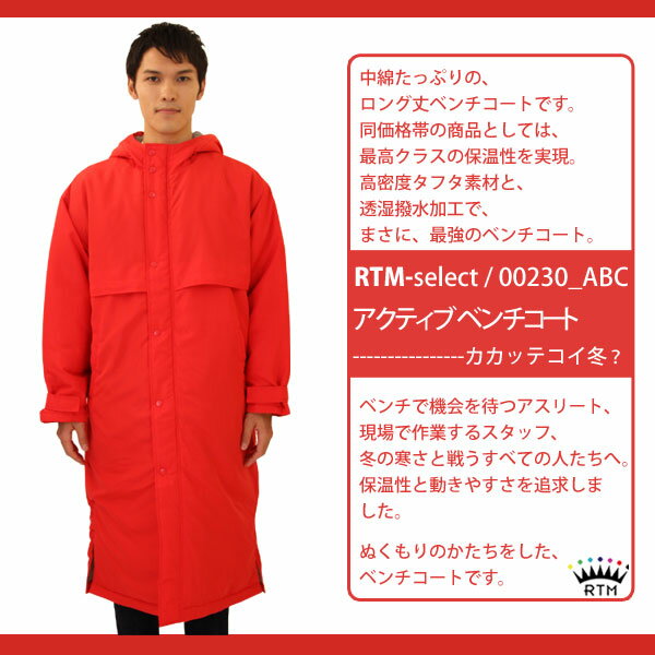 メーカー希望小売価格はメーカーカタログに基づいて掲載しています 素材 表地:ポリエステル100%高密度タフタ 中綿:ポリエステル100% 裏地:ポリエステル100%タフタ サイズ サイズ着丈身幅裄丈 150955678 S1126283 L1186888 XL1217191 特徴 ベンチコート素材『Printstar/t_00230-abc』は圧倒的な保温性を誇る、お手頃価格のベンチコートです。 注意 ※1cm?2cm程度の縫製誤差が生じる場合がありますので、予めご了承下さい。 ※PCやモニター環境によっては実際の色合いと異なる場合がございますので、あらかじめご了承ください。 ※ネットショップでの失敗しないサイズ選びはこちらでご確認下さい。かかってこい!! 冬【保温性MAX あったかベンチコート レディース メンズ ジュニア】 かかってこい!! 冬【保温性MAX あったかベンチコート】 たっぷりの中綿と高い襟、頼れるロング丈。 ベンチで機会を待っているアスリート、凍てつく冬の現場で仕事をする作業員など、 真冬の寒さと戦うすべての人々のために、最強の保温性を誇る一着ができました。 透湿防水素材を採用しているので、内側は蒸れにくく、外からの少々の雨などははじきます。 RTMがセレクトした商品は厳選素材感と絶妙なサイズ展開だから、 着心地がいいのは当たり前。 『アクティブベンチコート ジュニア/メンズサイズ』 ホワイトブラックネイビー ロイヤルブルーゴールドイエローレッド 有名ブランドのデザインベンチコートとして活躍している、 高品質なボディー素材RTM-select『Printstar/t_00230_abc』は圧倒的な保温性を誇る、お手頃価格のベンチコート ロングです。 ★真冬の寒さもなんのその!★あったかアクティブベンチコート レディース メンズ ジュニア サイズ
