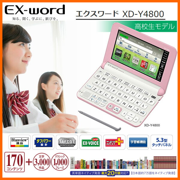 XD-Y4800 カシオ電子辞書 CASIO エクスワード 高校生モデル 製品仕様 品番 XD-Y4800 表示 5.3型タッチパネル(5.0型 528×320ドット TFTカラー液晶) 外形寸法 幅148.0×奥行105.5×高さ15.7mm(閉時、最薄部) 高さ18.5mm(閉時、最厚部) 質量 約265g(電池込み) 本体メモリー 約100MB 電源 ・単3形アルカリ乾電池LR6(AM3)2本または単3形eneloop(エネループ)2本または単3形充電式EVOLTA(エボルタ)2本 ・パソコンや別売USB-ACアダプターからのUSB給電 付属品 タッチペン1本、単3形アルカリ乾電池2本 特徴 ■高校の勉強から大学受験まで使いたい 予習・復習から受験まで、高校3年間をバックアップ 毎日の予習復習から大学受験まで、学力・成績アップに役立つ充実の収録内容。定評のある出版社のコンテンツを揃え、安心して学業に専念できます。 ■「英会話スキット · トレーニング」を収録。対話形式のネイティブ発音と文章(スキット)を収録しており、相手のセリフに答えるように発音 · 録音し、聞き比べて繰り返し練習することで、実践で役立つ英会話力を磨くことができる ■毎日の学習がはかどる 高校学習に定評のある出版社のコンテンツを厳選収録。 予習・復習はもちろん、大学受験まで活用でき、高校学習の強い味方になってくれる。 ■英語力強化をサポート 英単語、英熟語、英文法。基礎固めから実践力まで全面的に強化。 苦手を克服して、受験に通用する英語力を身につけよう。 ■多角的な学習を支援 画面は見やすく、ネイティブ発音は豊富に。便利な学習機能やスピーキング機能も搭載。 「見る」「聞く」「書く」「話す」を取り入れた学習方法で、確かな実力を身につけよう。 ■検定試験などを応援 エクスワードには、英検、TOEIC、TOEFL、漢検の対策に役立つコンテンツを豊富に収録。 検定合格、スコアアップなど、目標達成に向けたチャレンジを応援する。 ■持ち歩きにぴったり 毎日持ち歩いて、気軽に使えるエクスワード。 軽量ながら丈夫で電池長持ち。 入手が簡単な単3形乾電池だから、不意の電池切れの際も安心。 収録コンテンツ 収録コンテンツ一覧はコチラ⇒ 【楽ギフ_メッセ入力】【楽ギフ_のし宛書】[電子辞書 送料無料][電子辞書 高校生][高校生向け][高校学習][大学受験] 【商品ラインナップ・関連商品】XD-Y4800 カシオ電子辞書 CASIO エクスワード 高校生モデル カシオ2016年モデルの電子辞書XD-Y4800、今年7月に発売20周年を迎えるEX-word(エクスワード)”シリーズの新製品。 従来機種のXD-K4800(2015年1月発売)より英語学習におけるボキャブラリー、リスニング、スピーキングの進捗状況を グラフで確認できる新機能を搭載。従来の商品よりも大きく異なるポイントは、以下の3つです。 ●英語学習の進捗状況を確認できる新機能“English Training Gym(イングリッシュトレーニングジム)”を搭載 ●使いやすさを追求しホーム画面を刷新。ホーム画面に複数辞書検索が可能な検索ウィンドウを追加 ●業界初のスマートフォンやタブレットとの連携サービスを開始 近年、調べるという辞書としての役割に加え、参考書や問題集、動画やラジオ英語講座を収録し、学習ツールとしての 役割を両立!中でもネイティブ発音によるスピーキングやリスニングなど英語学習をサポートするコンテンツが好評♪ 予習・復習はもちろん、英語の対話力強化・大学受験まで活用でき、高校学習の強い味方になってくれる事、間違いなし!