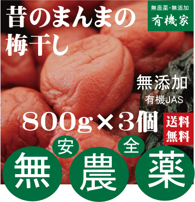 【放射能検査済】同位体研究所にて 検出限界1ベクレル未満にて不検出 【原材料】 有機梅は奈良県産です。 有機紫蘇は和歌山県産です。 塩は沖縄の「シママース」天日塩です。 ○名称:有機梅干し ○原材料名:有機梅、漬け原材料(有機しそ、食塩) ○内容量:800g×3個 ○賞味期限:別途商品ラベルに記載 ○販売者:奈良県 王隠堂農園 なにもしないから 美味しい? この梅干しの美味しさの秘密は 「なんにもしない」ことです。 有機栽培で育てた梅を 塩と紫蘇でつけただけなのです。 梅の持つ本来の旨みがある。 最近の変り梅干しは干し上げてから一度脱塩します。 この時に梅の旨みが抜けてしまうのです。 そして流行のハチミツやかつをのダシなどを加えるのです。 あとは防腐剤のビタミンCやクエン酸を加えて調整するのです。 すっぱすぎず、塩辛すぎず 絶妙のバランスです。 梅本来の旨みを抜いてしまうと酸味だけが強くなったり 塩辛さが前にでたりして早くいえば美味しくないのです。 赤紫蘇をふんだんに使い 紫蘇の香りときれいな赤色が食欲をそそります。 紫蘇は梅干しには欠かせませんがなかなか大変なんです。 漬ける梅の3分の1の量が必要ですが赤紫蘇を揉み込むと 小さくなってしまいます。だから大量の赤紫蘇が必要です。 大きすぎず食べやすい大きさです。 南高梅の大きな梅もいいのですが、梅1個でご飯一杯なんて なってしまいます。 食べ頃の大きさがいいのです。 焼酎の梅割にぴったりです。 梅の旨みが焼酎の旨みをぐっと引き立てます。 物足りない方は2個入れてください。 農薬を使わないで栽培した梅 農薬を使わないで栽培した赤紫蘇 自然塩だけで作りました。 農薬を使わないで栽培した梅自体、非常に珍しく探しても なかなかありません。 有機JAS認定の安全な梅干しです。 塩分:約17.7% わけあり安全野菜に戻る奈良県産の有機青梅と 和歌山県産の有機紫蘇と 沖縄の「シママース」塩だけで 天日干しで漬けこむ 「昔のまんまの梅干」です。 虫粒でほど良い大きさ 塩分、酸味、甘味のバランスが 程よくとれた梅干しで 力強い旨味は 玄米ごはんにピッタリです。 なにもしないから 美味しい? この梅干しの美味しさの秘密は 「余計なことはしない」ことです。 ただ熟練した職人さんが 旨い青梅を旨い赤紫蘇で 塩だけで漬けこんだだけなのです。 梅の持つ本来の旨みがある。 この青梅が相当美味しい旨味を持っていると 想像できます。たから他の有機梅干しとも 一味違うのでないでしょうか すっぱすぎず、塩辛すぎず 絶妙のバランスです。 赤紫蘇をふんだんに使い 紫蘇の香りときれいな赤色が食欲をそそります。 紫蘇は梅干しには欠かせませんがなかなか大変なんです。 漬ける梅の3分の1の量が必要ですが赤紫蘇を揉み込むと 小さくなってしまいます。だから大量の赤紫蘇が必要です。 大きすぎず食べやすい大きさです。 南高梅の大きな梅もいいのですが、 梅1個でご飯一杯なんて なってしまいます。 食べ頃の大きさがいいのです。 焼酎の梅割にぴったりです。 梅の旨みが焼酎の旨みをぐっと引き立てます。 物足りない方は2個入れてください。 農薬を使わないで栽培した梅 農薬を使わないで栽培した赤紫蘇 自然塩だけで作りました。 農薬を使わないで栽培した梅自体、非常に珍しく探しても なかなかありません。 有機JAS認定の安全な梅干しです。 塩分:約17.7% 放射能の検査結果は こちら をご覧下さい。 この「梅干」は ★中国産梅不使用 ★国産有機梅使用 ★化学調味料不使用 ★食品添加物無添加 ★保存剤無添加 ★合成着色料無添加 ★合成甘味料のステビア不使用 ★合成甘味料のチクロ不使用 ★合成ビタミンC不使用 ★防カビ剤不使用 なので安心安全です。