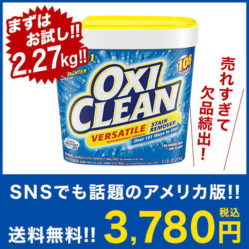 送料無料★国内では当店のみの限定パッケージ!売り切れ続出!話題の酸素系漂白剤です♪ 大型倉庫店で売り切れ続出! インスタでも話題の酸素系漂白剤アメリカ版「オキシクリーン」が販売開始しました! 衣類からキッチンまで使えるマルチ洗剤「オキシクリーン」! 待望のアメリカ版が入荷しました! しかも、日本ではここだけしか手に入らないパッケージです! 酸素系漂白剤に洗浄成分をプラスした協力な洗浄力で、 頑固な汚れをスッキリきれいに落とします。 「大型店で売っているオキシクリーンは大きくて試しに使えない…」 「いつも売り切れているので、いつも買えない…」 噂の洗浄力をぜひお試しください! スペック 内容量:2270g 品名:衣類・布製品・台所まわり・水まわり・食器・家具用漂白剤 成分:過炭酸ナトリウム(酸素系)・界面活性剤(アルコールエトキシレート)・炭酸ナトリウム (洗浄補助剤)・洗浄補助剤 液性:弱アルカリ性 形状:粒状 正規販売代理店/原産国:アメリカ ※オキシクリーンは米国、チャーチ&ドワイト社の登録商標です。 使用上の注意 用途以外にご使用にならないでください。 熱湯ではご使用にならないでください。 必ず使用前に目立たない場所で試し、乾燥させた後に、色落ちがないかをご確認の上ご使用ください。 ウール・ウール混・シルク・シルク混・革製品は使用しないでください。ドライクリーニングのみと表示された服・宝石・ラテックスのペイントのあるもの・編んだかご・塗装のない木枝(籐カゴや、籐でできた家具など)・麻・チーク材・仕上げ木材には、使用しないでください。金属につけないでください。万が一ついた場合には、すぐにきれいに洗い流してください。さびた場所、乾いた塗料部分、漂白で傷んだ箇所には使用しないでください。浄化槽にお使いいただけます。 お湯の温度や、洗濯できる服、お手入れが出来るものについては、製品に付いている洗濯表示に従いご使用ください。 お湯(40〜60℃)でご使用いただくと効果的です。水でご使用の場合は、本剤を少量のお湯で溶かして溶液を作り、水と混ぜて下さい。 シミがついたらすぐに洗浄し、水でよく洗い流してください。十分にすすいでいない衣類・布を乾燥機の中に入れないでください。 ご使用量の目安より多量に本剤を入れると、色落ちすることがありますので、十分にご注意ください。 洗濯洗剤以外(アンモニアを含む製品、還元系漂白剤、塩素系漂白剤、家庭用洗剤)とは混ぜないでください。 リン酸塩は含まれていません。 お子様やペットの手の届かない場所に保管してください。 直射日光を避け、高温になる場所では保管しないでください。 密封した容器で混ぜたり、放置しないでください。容器が膨張し破裂することがあります。 商品容器に水や他のものを入れないでください。 応急処置 目に入った場合は、すぐに水で十分洗い、医師の指示に従ってください。 皮ふについた時は、すぐ水で洗い流してください。 万一飲み込んだ場合は、水を飲ませるなどの処置をして、医師の指示に従ってください。 目や肌にかゆみ等の異常を感じた時は、使用をやめ、医師の診断を受けてください。