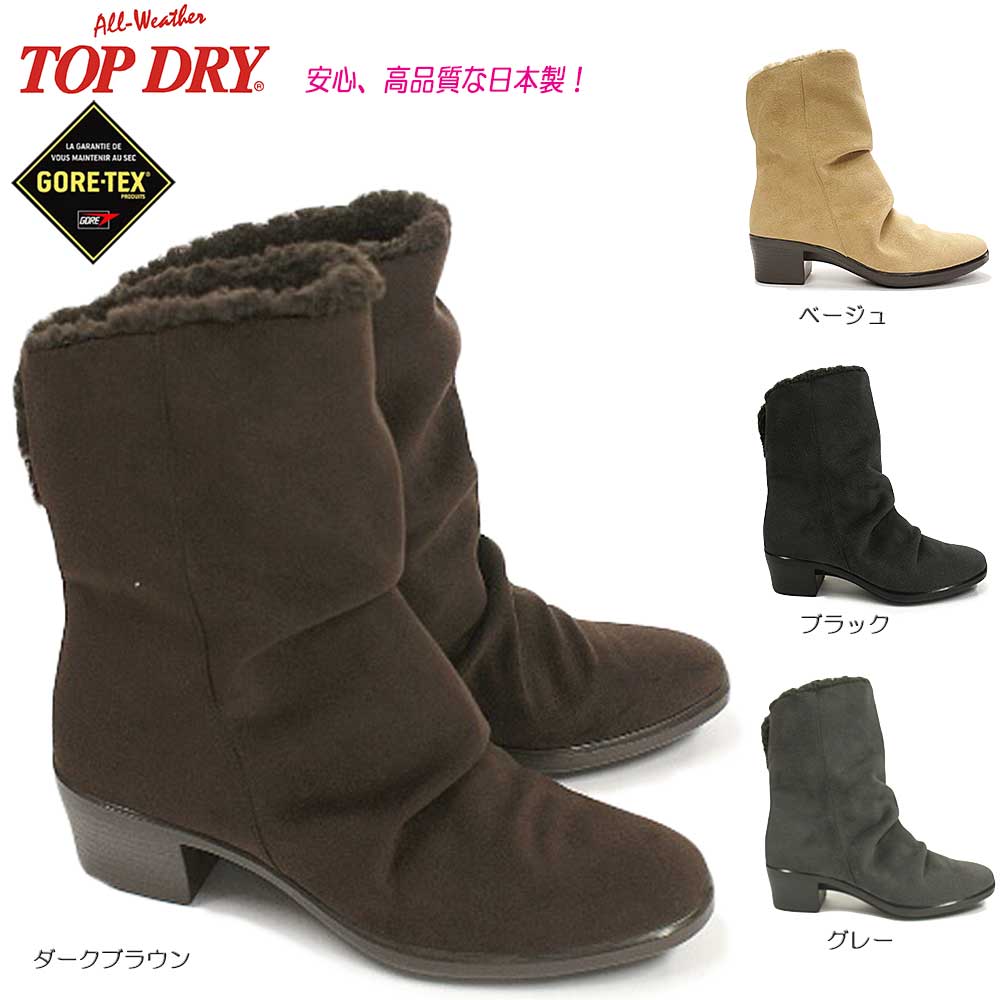 メーカー希望小売価格はメーカーサイトに基づいて掲載しています ゴアテックスを使用した定評あるトップドライのブーツ。とっても軽量ではきやすいです。スッキリとしたフォームにドレープのはいったオシャレなデザイン。ガラス繊維配合の防滑ソールで凍結路面OK。雨の日はもちろん、雪の上でもバッチリバシバシ履けます。水はシャットアウトなのに、通気性バツグン。蒸れにくいので、ブーツの中は汗をかきにくい。さらに消臭・抗菌加工で衛生的。シンプルなデザインであわせやすさもGood。●幅、足入れ等・・・3E。足入れはとてもよいです。幅はゆったりしています。素材●撥水合成繊維(スエード)+ゴアテックス(100%防水を保障するものではありません。)アウトソール:合成底※セラミックソール内側のボアは履き口より9cm(後方)?12cm(前方)程度までです。全体の長さ●24cm(筒丈:19cm+ヒールの高さ:5cm)履き口周り●約28.5cm前後(履き口を二つ折りにしてメジャーで測った数値を2倍にして素材の厚み分を差し引いた数値です。多少の誤差はお許しください。)重量●片足300gご注意・・・各数値ははいずれもサイズ23.5cmで計測した場合。原産国●日本TOPDRY 雪国仕様【smtb-TK】 ストッキングなら23.0cmでちょうど良いです。 ソックスを履く場合は23.0cmだとつま先があたるので23.5cmがよいですが幅はずいぶんゆったり目になります。 22.5cmでちょうど良いです。 24.5cmでちょうど良いです。 ソックスを履いて23.5cmでぴったりです。Color Variation ベージュスエード ブラックスエード ブラウンスエード グレースエード