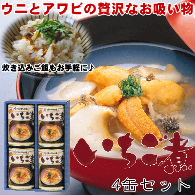 ギフト対応 名称 和風汁(ウニとアワビのお吸い物缶詰) いちご煮(郷土料理) 原 材 料 名 魚介類(ウニ、ロコ貝、アワビ)、帆立貝エキス、かつお節エキス、ネギ、食塩、たん白加水分怪物、シソの葉、調味料(アミノ酸等) 内 容 量 415g×4缶(化粧箱入) 賞 味 期 限 製造日から約3年 保 存 方 法 直射日光を避け常温保存してください 製 造 者 株式会社 味の加久の屋 この商品は・・・お世話になった方へ感謝の気持ちをこめて 豪華な海の幸ギフト!! 量より質にこだわりたい方に おすすめの逸品! お中元やお歳暮に!! 奥深く上品な味わいです!!! 大切な方へ贈るお祝いやプレゼントに最適なギフト対応を承ります。 各商品に付いているアイコンの説明は以下の通りです。 ●名入れをご希望の場合は備考欄等に忘れずにご記入ください