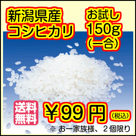 【28年1等米】 <商品のお届けについて> こちらの商品は、メール便お届け。 ご指定地の郵便ポストへの投函です。 お試し品 2合、3合、6合、1キロ等いろいろな商品をご用意しています。 一人でも多くの方に 召し上がっていただくための企画です。 楽しいお買いものをφ(o^-^o)/” 商品名 【28年産】 新潟県産コシヒカリ 150g 全国【送料無料】 ※メール便でのお届け。他の商品との同梱が出来ないことがあります。 内容量 150g(一合) 名称/精米方法 白米又は、玄米 年産 28年産 商品内容 新潟県産コシヒカリ 配送方法 保存方法 高温多湿を避け、風通しのよい冷暗所でフタ付の容器等で保管してください。お届け後は可能な限りお早くお召し上がりください。 【消費の目安】 冬季〜約1ヶ月 夏季(6月から9月)〜可能な限り早く 春秋季〜約1ヶ月うどん、ラーメン、おそば。世の中に食べ物はいろいろありますが、賞味期間は結構長い。常温でも保存ができたりして、大変便利です。それに比べてお米は、20日から30日ほど。保管容器に移しかえて、冷蔵庫などで保管し、フレッシュなうちに食べて頂かなくてはいけません。なぜかというと、国産100%。栄養があって無添加、自然のままで お届けする食べ物だから。安全・安心の面から考えると、虫がつきやすいってスバラシイですよね。 送料 代引手数料 精米方法 玄米 追加ご注文の同梱に ついて 他の商品を同梱の場合は、別途送料が生じる場合がございます。 決済方法 クレジット、銀行振込、郵便振替、楽天ポイント決済の、いずれかでお願いします。 ※他の決済方法ご利用の場合は、変更をお願いする事がございます。 商品お届け 指定 お届け日、お届け時間指定不可 (メール便/ご指定地の郵便ポスト投函) 新潟県種子協会から供給された種子、100%更新された種籾を使用、産地JA(農協)の栽培基準に基づく生産管理が行われたお米(JA米)です。全国のJAグループが守るお米の認証規格によって管理されたことで、産直米よりも高品質なコシヒカリをお楽しみいただけます。魚沼産コシヒカリを始め、超人気コシヒカリが収穫される、新潟県の【最高級コシヒカリ】をお届けします。楽天ショップ 開店16周年記念 【 お試し セール♪ 】 お一人様 一回限り 二回目からはキャンセル 期間限定・数量限定の今だけ企画!! 最高級米☆ 新潟県産コシヒカリ 150g(1合) お試しパックが。。。 ぜひお試しくださいませ。 期間限定!数量限定の特別企画ですので お見逃し無く!! お試し商品2合、3合、6合、1キロ等いろいろな商品をご用意しています。 一人でも多くの方に 召し上がっていただくための企画です。 楽しいお買いものをφ(o^-^o)/” 楽天出店店舗の中で 初の受賞店 【農林水産省総合食料局長賞】 かきもと米穀は、農産物検査を受けた米だけをお届けしています。 安心してお召し上がりいただけます! >>詳しくはこちらのページへ 「全国一律送料無料!」 99円(税込)で 販売します。 お届けは、ゆうメールになります。 (お届け日、配達時間指定不可) ↓ ご注文が確認出来ましたら 「ご注文誠にありがとうございました」 メールを お送りしますので、ご確認下さい ↓ 【その他の注意事項】 1.他の商品と同梱可能ですが その他の商品を一緒にお届けの場合は 送料は、同梱商品の送料に準じます。 2.購入は カード決済、銀行振込、郵便振替のみです。 (単独発送で、代引きをお選び頂いた場合には ご注文キャンセルと、させていただきます) (ポイント全額購入のお客様は 銀行振込をお選び下さい。) 3.熨斗や、ギフト包装等は不可です。 4.商品は、ご注文を頂いた順に発送してまいります。 (ご注文殺到の際は、少々お時間がかかる場合がございます)メール便のためお届け荷姿は封筒です。ご理解下さいませ。 米袋の写真はイメージして頂くため5キロ袋を使用しています。5キロではありません。ご理解ください。 【その他の注意事項】 1.他の商品と同梱可能ですが その他の商品を一緒にお届けの場合は 送料は、同梱商品の送料に準じます。 2.購入は カード決済、銀行振込、郵便振替のみです。 (単独発送で、代引きをお選び頂いた場合には ご注文キャンセルと、させていただきます) (ポイント全額購入のお客様は 銀行振込をお選び下さい。) 3.熨斗や、ギフト包装等は不可です。 お得価格のため簡易包装です。ごめんなさい。 4.同一住所お届けの場合は、まとめてお届けします。 5.商品は、ご注文を頂いた順に発送してまいります。 (ご注文殺到の際は、少々お時間がかかる場合がございます) メール便のためお届け荷姿は封筒です。ご理解下さいませ。
