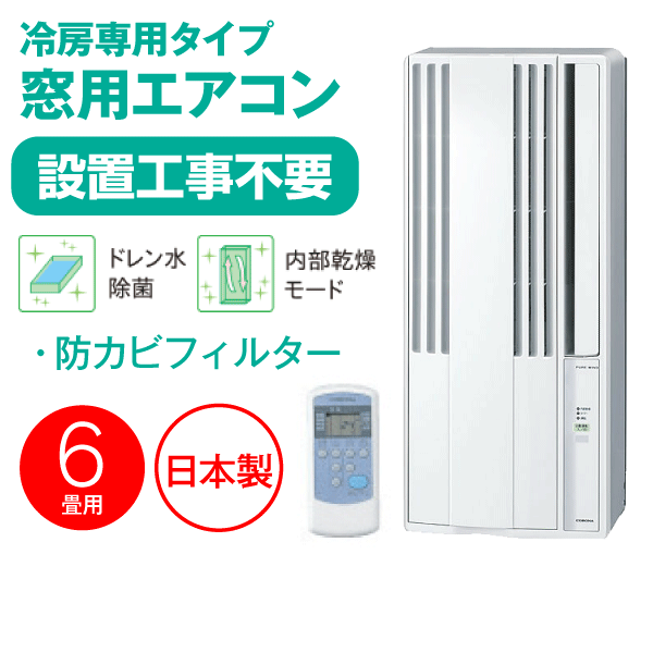 【数量限定】【送料区分:特中型】 コロナ(CORONA) ウインドエアコン(窓用エアコン) 冷房専用(おもに6畳用) 日本製 ノンドレン シェルホワイト CW-1617-WS 工事不要。窓に簡単取り付け! ●ノンドレン(ドレンホース不要) ●アルミ製標準窓枠同梱 ●おやすみ自動運転 ●自動運転 ●低振動設計 ●防カビフィルター ●洗えるパネル ●ドライ運転 ●切・入タイマー(12時間) ●液晶リモコン本体収納可能 ・内部乾燥モード 運転停止後のクリーン機能としてエアコン内部を乾燥させ清潔に保ちます ・ドレン水除菌 ウインドエアコンの底部に溜まったドレン水に銅イオンを満たすことで、細菌の繁殖を抑えます サイズ:750×335×240mm(高さ×幅×奥行) 重量:21.0kg 【送料について】 数量・決済方法等によりましては、別途、追加送料等が必要な場合がございます。取付などでご不明な点などございましたら メーカーのサポートへお問い合わせ下さい。 関連商品 高さがある窓に使用するときは 別売りの延長枠が必要です! 【5年間延長保証】 同時購入いただければ、 ご購入後も安心です!