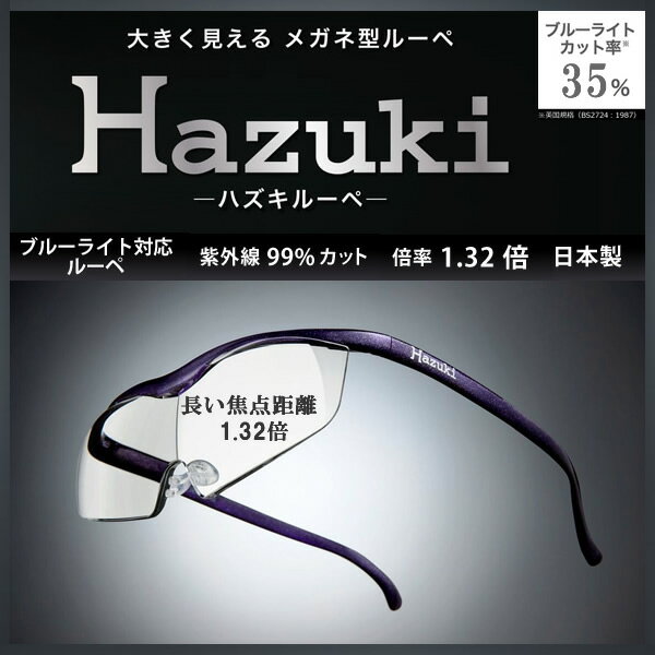 Hazuki ハズキルーペ クリアレンズ 「ハズキルーペ ラージ」 ブルーライト対応 拡大鏡 1.32倍 / ブルーライトカット率35% 【製品仕様】 品名 【ハズキルーペ ラージ】 2017モデル ブルーライトカット クリアレンズ 1.32倍 紫 JAN:4964594732340 本体寸法 本体サイズ:W145mm×H45mm レンズサイズ:W136mm×H42.5mm フレームの長さ:164.5mm 本体質量 約 22.0g 主な原材料 レンズ:アクリル樹脂 フレーム:特殊ポリアミド樹脂 鼻パッド:エラストマー樹脂 製造 日本 特徴 ※メガネとの二重掛けに便利 レンズが大きく、横フレームが長い設計のため、メガネとの二重掛けがしやすいタイプです。 また、2017年モデルからさらに軽量になり、二重掛けがより便利になりました。 大きく見えるメガネ型ルーペ'ハズキルーペ'の ラージタイプのブルーライトカット クリアレンズ 大きく見えるメガネ型拡大鏡の「ハズキルーペ」シリーズの中でもワイドな視野で大きく見やすい定番モデルの「ハズキルーペ ラージ」。 大きなレンズで、歪みなく大きくはっきり見えるので小さな文字が見づらい方だけでなく、焦点距離が長い為、PCやスマホ、タブレット端末、ゲームの操作が自然な姿勢で快適に操作できるので大変人気の商品です。 こちらのモデルはブルーライト35%カット クリアレンズ、倍率1.32倍のモデルです。 普段使いから、細かい作業時だけでなく、スマホやPC、ゲームをする時にもご使用頂けます! [基本セット]: ハズキルーペ本体/専用ケース/メガネクロス/使用説明書兼保証書 [焦点距離の目安] PCやスマホ、タブレット端末、ゲームの作業に適しています。 約50cm〜70cm離して見える位置を調整ください。 見え方・焦点距離には個人差がございます。 ※これは老眼鏡ではありません。メガネ型ルーペ(拡大鏡)です。ハズキルーペ クリアレンズ 「ハズキルーペ ラージ」 ブルーライト対応拡大鏡 1.32倍 / ブルーライトカット率35%