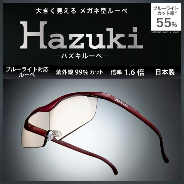 Hazuki ハズキルーペ カラーレンズ 「ハズキルーペ ラージ」 ブルーライト対応 拡大鏡 1.6倍 / ブルーライトカット率55% 【製品仕様】 品名 【ハズキルーペ ラージ】 2017モデル ブルーライトカット カラーレンズ 1.6倍 赤 JAN:4964594732128 本体寸法 本体サイズ:W145mm×H45mm レンズサイズ:W136mm×H42.5mm フレームの長さ:164.5mm 本体質量 約 27.5g 主な原材料 レンズ:アクリル樹脂 フレーム:特殊ポリアミド樹脂 鼻パッド:エラストマー樹脂 製造 日本 特徴 ※メガネとの二重掛けに便利 レンズが大きく、横フレームが長い設計のため、メガネとの二重掛けがしやすいタイプです。 また、2017年モデルからさらに軽量になり、二重掛けがより便利になりました。 大きく見えるメガネ型ルーペ'ハズキルーペ'の ラージタイプのブルーライトカット カラーレンズ 大きく見えるメガネ型拡大鏡の「ハズキルーペ」シリーズの中でもワイドな視野で大きく見やすい定番モデルの「ハズキルーペ ラージ」。 大きなレンズで、歪みなく大きくはっきり見えるので小さな文字が見づらい方だけでなく、ネイルや手芸、読書などの細かい作業をされる方にも人気の商品です。 こちらのモデルはブルーライト55%カット カラーレンズ、倍率1.6倍のモデルです。 ピンクブラウンのレンズが目に優しく、PCやスマホ・タブレット等の気になるブルーライトからの負担を軽減します。大人だけでなく、ゲーム等をするお子様にもお使い頂けます! [基本セット]: ハズキルーペ本体/専用ケース/メガネクロス/使用説明書兼保証書 [焦点距離の目安] 手元での作業に適しています。 約30cm〜40cm離して見える位置を調整ください。 見え方・焦点距離には個人差がございます。 ※これは老眼鏡ではありません。メガネ型ルーペ(拡大鏡)です。ハズキルーペ カラーレンズ 「ハズキルーペ ラージ」 ブルーライト対応拡大鏡 1.6倍 / ブルーライトカット率55%