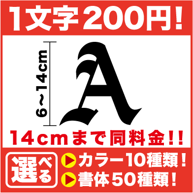アルファベットのカッティング文字ステッカーです。アプリケーション済!完全仕上げでこの価格! ステッカー 文字 シール 書体と色、一文字あたりの大きさを選んで、欲しい文字でカンタンセミオーダー! 一文字分のお値段となります!ご希望の文字数を買い物かごに入れてください! 大文字と小文字が混ざる場合は、大文字の値段となります。大きさは当店にて大文字に合わせて調整致します。 句読点やハイフンなども一文字としてカウントされます。 ご注文の際には備考欄に希望の文字を忘れずにご記入ください! 文字だけが残る防水カッティングシートステッカーです。 枠などがついていないスタイリッシュな仕上がり! 車体に貼られる場合は剥しにくいのでご注意ください。 縦や横にステッカーを繋げたい、選択肢にないサイズが欲しい、一文字ずつバラバラにしたい、○○cm以内に収めたい、など、細かいご希望がある場合にはご注文時備考欄にご記入ください。アルファベットの文字のカッティングステッカーです。車やバイクヘルメット、スーツーケース、ポスト、表札、看板等々趣味に仕事に様々な用途でご利用ください!屋外使用もOK!防水です。